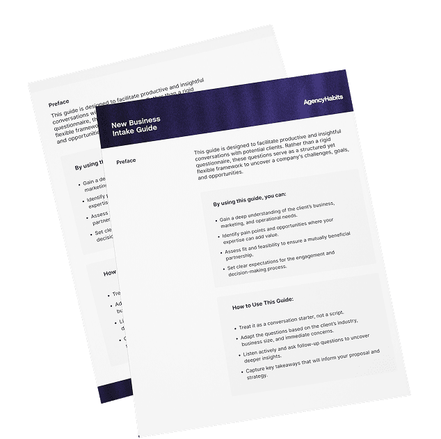 Real, winning proposals and SOWs from Barrel Holdings agencies along with our New Biz Intake Guide and Agency Lead Tracker. Also includes the Agency Growth Engine Playbook.